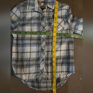 Chic plaid design with button closure. Soft and comfortable fabric. Plaid button up with silver threading