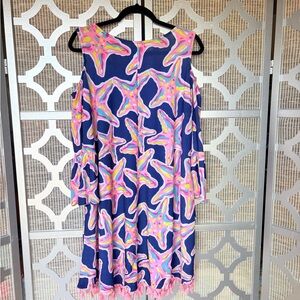 Chic asymmetrical dress with vibrant starfish design. Features bold pink and blue colors. Perfect for a stylish summer look.