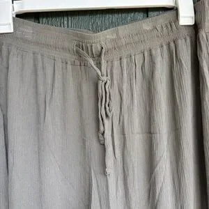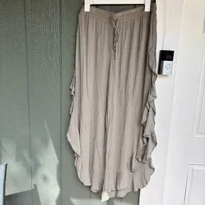 Flowy and feminine, these Cato pants are perfect for a relaxed boho look. Lightweight crinkle-textured fabric with a pull-on elastic waistband, drawstring tie, and ruffle trim along the sides and hem. The wide-leg cut makes them easy to wear and the knee height leg slits gives a breezy, almost skirt-like silhouette.
