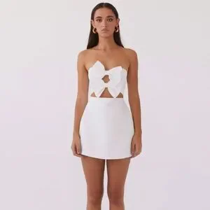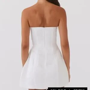 Elegant white strapless dress with a bow design. Perfect for special occasions.