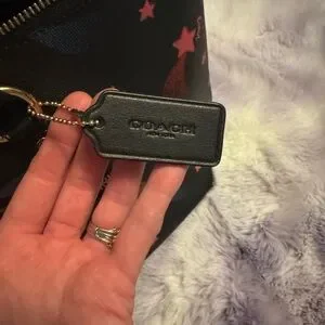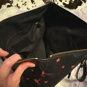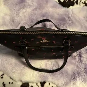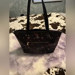 Chic Coach tote with vibrant pink stars. Sleek black finish. Ideal for any occasion. This coach bag is very stunning coming out with its beautiful features. The horse drawn carriage in gold with its finishing matching it exactly. Black interior on this bag. There are no callouts on this bag. She’s pristine! The stars are pink with the logo coach. Authentic Coach and comes with her tag. The black tag is a hard leather. Printed coated canvas and smooth leatherInterior zip, cell phone and multifunction pocketsTop zip closure, fabric lining. Handles with 10 1/4" drop