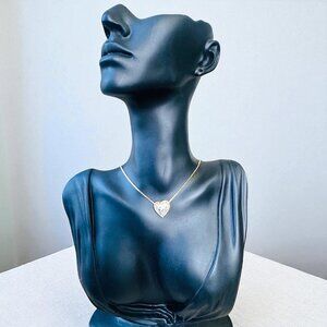 This exquisite vintage 1980s Panetta necklace showcases a heart-shaped pendant encrusted with faux diamonds, exuding the opulence of a bygone era. Its gold-tone chain complements the sparkling heart, creating a timeless piece that captures the essence of vintage glamour. A splendid addition to any jewelry collection.