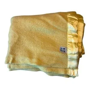 Warm buttery yellow blanket with satin trim by Kenwood Wool. Ideal for cozy nights. Stored in plastic and ready to ship 🚢.