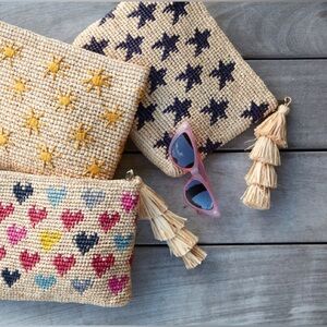 Bold hand crocheted stars and an oversized tassel adorn this stylish new addition to our clutch collection. Pairs perfectly with our Estrella tote.