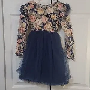 Navy Blue tulle skirt with a Floral long sleeve Top with ruffle accents