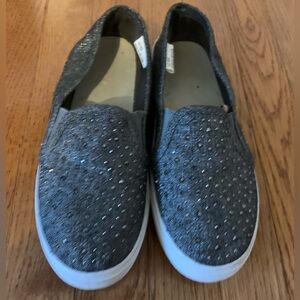 Stylish gray slip-on shoes perfect for casual outings. Comfortable and easy to wear. Gray shoes have embellishments on the top and a white sole. Size 8 shoes are mostly man made materials.