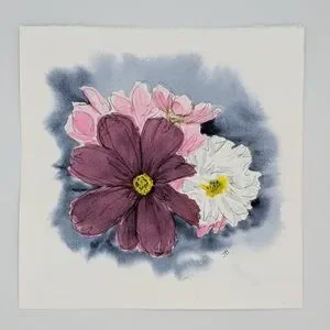 Charming floral watercolour painting showcasing vibrant pink and purple flowers with a hint of white.