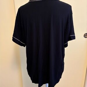 Soft black pajama top with white piping. Features button-up front and chest pocket. Ideal for relaxing evenings. Top only.