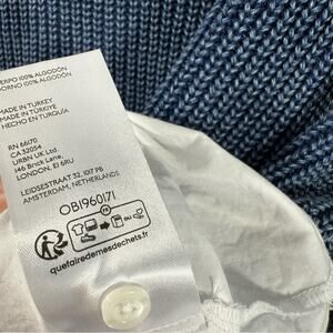 Blue chunky knit asymmetrical sweater layered over a white button down top peeking out the bottom.