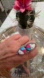 Beautiful ring with turquoise and pink stones. Silver detailing adds elegance.