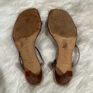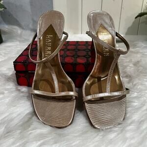 LRL Ralph Lauren Leather T-Strap Metallic High Heel Snakeskin Slides Sandals 5.5