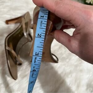 Gorgeous and Effortlessly Elegant LRL Ralph Lauren Leather T-Strap High Heel Reptile Snakeskin Embossed Metallic Slides Sandals. 3.2” Heels. Metallic Antique Gold. Women’s Size 5.5