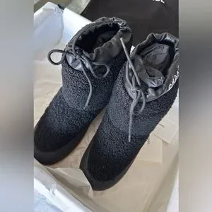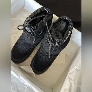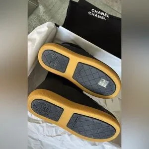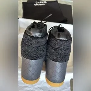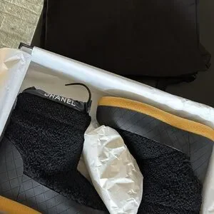 Elegant black shearling boots by CHANEL. Cozy and stylish for winter wear. Features a sleek design with a comfortable fit. New