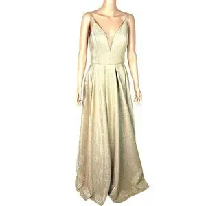 This metallic gold evening gown radiates elegance with its shimmering fabric and flowing silhouette. The plunging V-neckline and open back create a captivating design, while the practical addition of pockets marries functionality with luxury. Adjustable straps ensure a tailored fit, making this a standout piece for formal events.