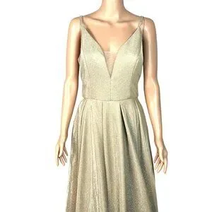 • adjustable straps, shimmering, metallic gold, evening gown, princess gown, fit and flare, plunging back, low v neckline with mesh, zip, pockets, flowy, pleating, long, drag, prom, homecoming, Christmas party, holiday, cruise formal night, wedding guest, wedding party, resort formal dinner, pageant,