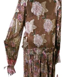 The Hemant and Nandita Fara Kaftan in size small is a stylish and versatile piece perfect for various occasions such as travel, weddings, parties, and more. This floral-patterned kaftan features a V-neckline, long sleeves with ruffle accents, and a pullover closure for easy wear. Made of a blend of viscose and metalized fiber, this multicolor kaftan is adorned with tasseled accents and has a removable slip underneath for added comfort. The oversized design and sheer fabric make it a perfect choice for summer and spring seasons, adding a touch of elegance to any wardrobe.