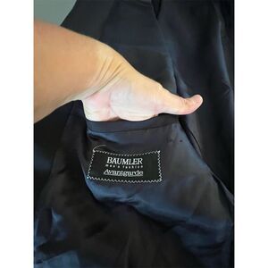 This Baumler blazer is a men's size large, with a classic fit. It features a single-breasted, two-button front with a notch lapel and a single-vented back. The blazer includes inner pockets for convenience. Designed for formal occasions, it is ideal for elegant events in the fall season. Made in Austria, this blazer requires dry cleaning. The condition is pre-owned. Keywords: Baumler, men's blazer, formal wear, elegant, blazer, classic fit, single-breasted, notch lapel, Austria, pre-owned.
