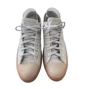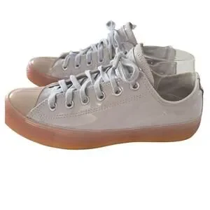 Stand out in style with these Converse Chuck Taylor All Star Ox Patent Leather Sneakers in glossy light grey with translucent gum soles. This unique model (Style 165607C) adds a modern, fashion-forward twist to the iconic low-top Converse.
