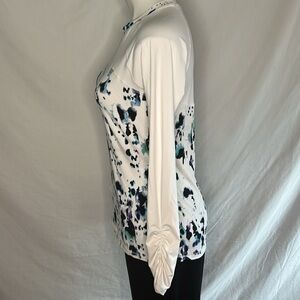Calia by Carrie Underwood women's long sleeve top. Featuring a unique paint splatter blue and black pattern on a white base,