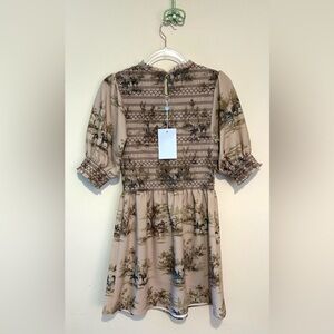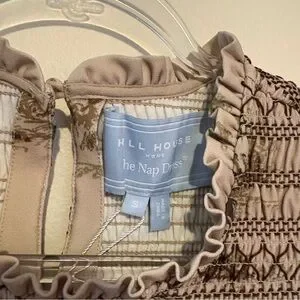 New Hill House Vivi nap mini dress in multi equestrian toile stretch crepe. With smocking at the bodice and sleeve cuffs for a flexible, comfortable fit, Vivi also features a high neckline and midi-puff sleeves. The Equestrian Toile print is a vintage wallpaper panel sourced from the Design Library and features warm colors on a classic khaki-colored base. The Stretch Crepe fabric is wrinkle-resistant, thick and structured with a stretch that provides a more fitted look. New with tags attached. Size small.