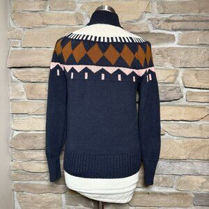Free Assembly sweater, women’s small pullover, navy blue sweater, Fair Isle sweater, geometric knit, turtleneck pullover, winter sweater, cozy cotton wool blend, cold weather knit, fall fashion