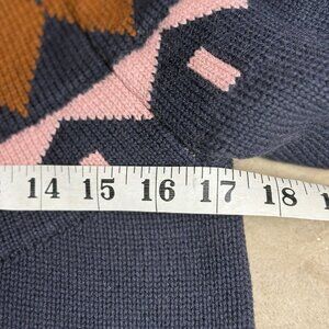 Cozy women’s pullover sweater by Free Assembly in size Small. Features a navy blue knit body with a bold geometric Fair Isle yoke design in rust orange, blush pink, and cream. High ribbed turtleneck, ribbed cuffs, and hem for a snug, warm fit.