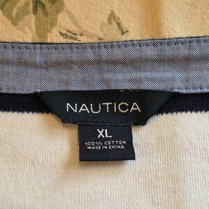 The Nautica blue and white striped boatneck top in women's size XLarge is a stylish and versatile addition to any wardrobe. Made from comfortable cotton material, this 3/4 sleeve top features a pullover closure and a casual nautical theme, perfect for summer, fall, or spring occasions. The boat neckline adds a touch of sophistication to the basic blouse style, while the striped pattern gives it a classic and timeless look. Perfect for casual wear, this top from Nautica is sure to become a go-to piece for any woman looking for a nautical-inspired top in a comfortable and trendy size.