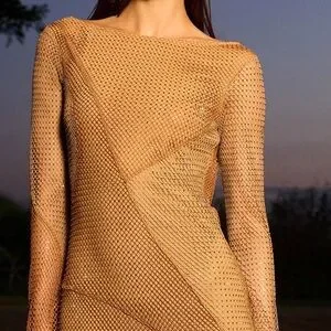 Stunning fishnet bronze dress with long sleeves. Perfect for evening wear.