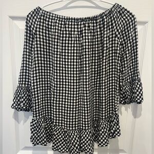 Beach Lunch Lounge black and white gingham plaid top that’s off the shoulder with ruffles and 3/4 sleeves.
