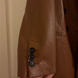 Stylish brown leather jacket. Double-breasted design. Perfect for any occasion.