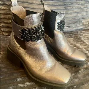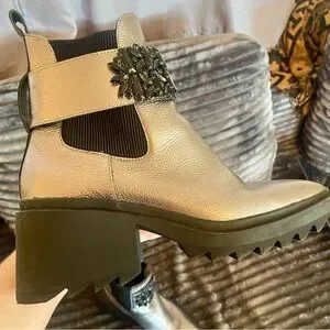 Chic silver boots with bold black embellishments. Perfect for a stylish look.