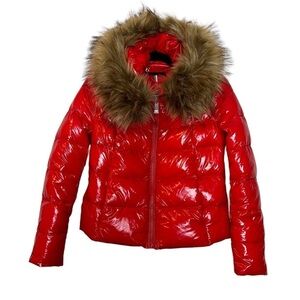 This ZIAI red wet look puffer jacket is so on trend and has a detachable fur trim hood! Red is the color for this years fall and winter wardrobe and this jacket has it all! There are two front slide pockets a heavy duty front zipper closure. The pockets have snap closures and the zipper pull is gun medal in color and still has the plastic on it. This jacket is new without tags . It also has two toggle pulls at the waist to keep you extra warm as well the same at the collar. The ample hood can be pulled forward to block out the elements and the oversized faux fur trim on the hood is a fun and functional fashion statement. The size is a European 36 or a US XS/S . Please refer to the measurements to be sure of fit. Thank you. The measurements are PTP 19” length 21” and sleeve 24”. There is a slight mark on the right sleeve that is very difficult to see but I do want to disclose it. It seems to be something that is part of the actual fabric when it came from manufacturer as I can’t seem to get it removed and because of the fabric and bold style it is barely noticeable but I do want to disclose it. Please refer to last photos. Thank you. Rare to find right now, this jacket is a fun trendy piece to add to your wardrobe. 😊