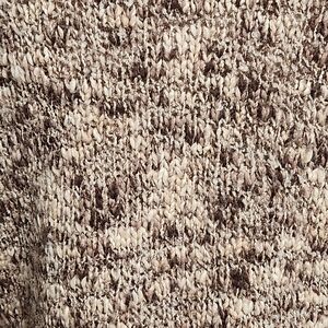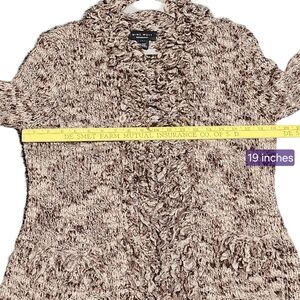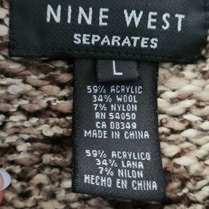 Pre-owned Nine West cardigan sweater, brown marled wool blend with textured ruffle trim and hook-and-eye closure at neckline. Women’s size large. Gently worn, in good condition.