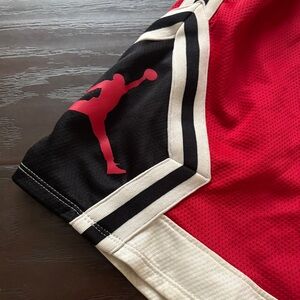 Jordan Jumpman Red Black & White Basketball Shorts. Pre-loved but still badass. 90s vintage fit. Michael Jordan Chicago Bulls colors. Aftermarket drawstring and has pockets. Runs a bit small perhaps, since tag says XL but waist is 34. Sold as is with measurements in photos. From a clean & smoke-free home. CERTIFIED RAD by @DubsmashDude 🤙🏼
