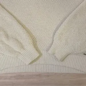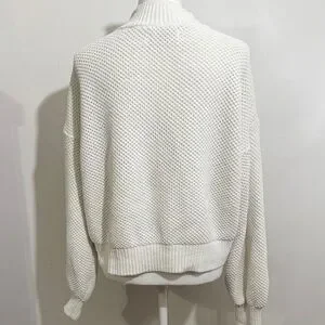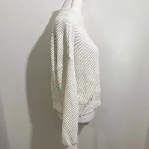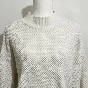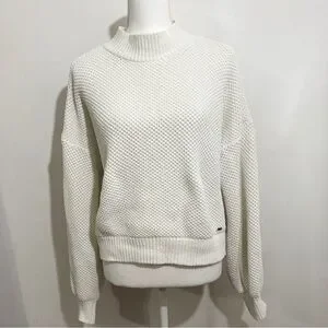 Cozy and stylish Hollister women’s sweater in a soft ivory/white textured knit. Features a mock neck, drop shoulders, balloon-style sleeves, and ribbed trim at the cuffs and hem. Perfect for layering or wearing on its own for a chic casual look.