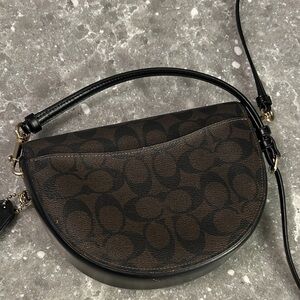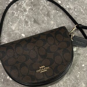 Chic Coach crossbody with iconic pattern. Features sleek design and adjustable strap.
