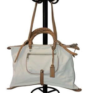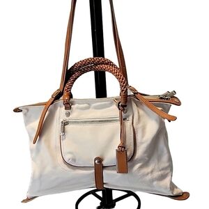 Beautiful genuine leather tote bag made in Italy with white leather and cognac detail leather ๐. Silver hardware, lovely braided handle, yes it has a strap, extra front pocket, suede lining, and more. New without tags, order it today ๐โค๏ธ๐.
