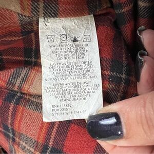 • Material: Corduroy body, cotton/poly plaid sleeves, branded metal buttons,