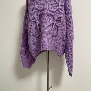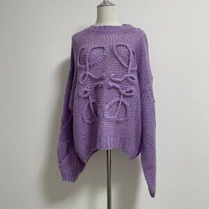 Loewe Anagram Sweater in Parma Violet - Purple. 67% mohair 28% polyamide 5% wool. Made in Italy. Dry clean only. Open crochet knit fabric. Garment is made with a semi-sheer fabric, undergarments can show through.