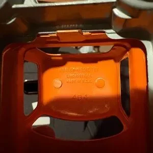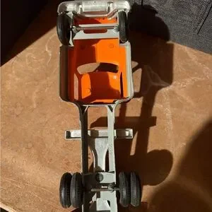 This vintage orange and gray metal toy truck is perfect for any collection.