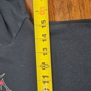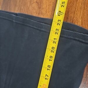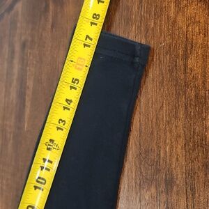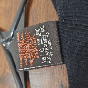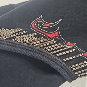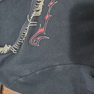 Chic black top with 3/4 sleeves. Features a unique embellished neckline.
