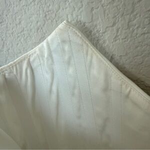 Some dark marks on bottom of detachable overlay skirt/train that didn’t come out in dry cleaning. Some small pulls throughout the dress and overlay skirt (fabric is very delicate!) one small makeup mark inside dress near chest that didn’t come out in dry cleaning. See photos!