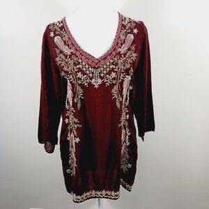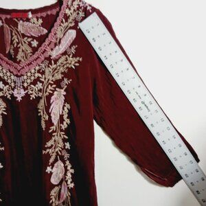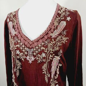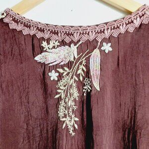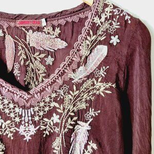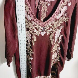 Johnny Was, Burgundy Brown Embroidered Boho Chic Top, Lt. Wt., Semi-Sheer, Small