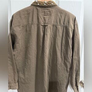 Stylish brown button-up shirt with bejeweled collar and pockets. Perfect for adding a touch of glam to your outfit.