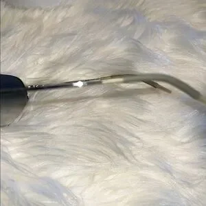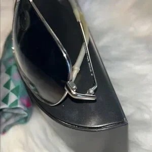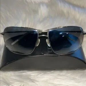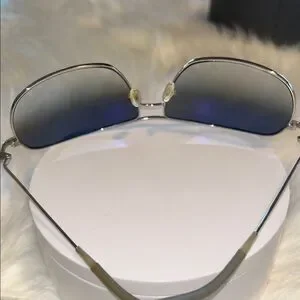 Elegant aviator sunglasses with a sleek silver frame and blue lenses. Includes branded case and cloth.