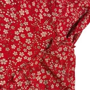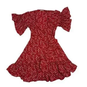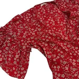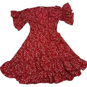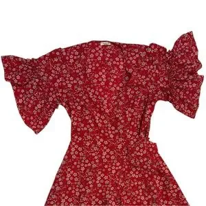 Red dress with delicate floral design and ruffled short sleeves. V-neck. Wrap style. No stretch. Can easily be sized up or down due to wrap tie. Only worn once!