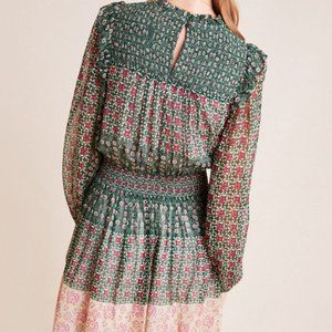 Anthropologie Rhiannon Floral Smocked Waist Chiffon Sheer Green Pink Dre…
