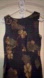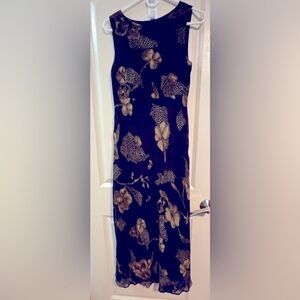This elegant sheath dress by Carole Little features a striking gold floral pattern on a rich navy background, perfect for a wedding guest or cocktail event. The sleeveless design and crew neck and empire waist adds a touch of sophistication, while the length (54 inches) offers a timeless silhouette. Crafted with a sheer overlay and hidden side zipper, this dress exudes a refined and formal appeal.