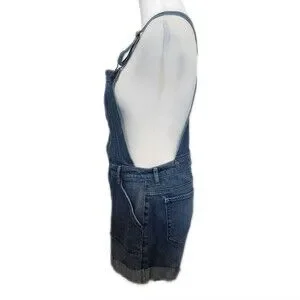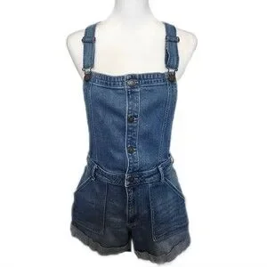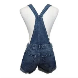 Stylish blue jean shorts overalls. Features button-up front. Adjustable straps for comfort.