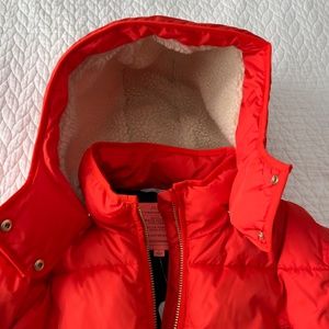 Vibrant red puffer jacket. Features zippered pockets. Warm and stylish design.